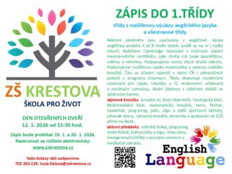 Zápis do prvního ročníku se koná v pondělí 19. ledna 2026 od 13 hod. do 18 hod. a v úterý 20. ledna 2026 od 13 hod. do 17 hod. (pro rezervace do 18 hod.) Budoucím prvňáčkům nabízíme od září 2026 třídu s rozšířenou výukou angličtiny výukovou metodou CLIL a třídu s všestranným zaměřením. V obou třídách se děti učí angličtinu hravou… číst dále…