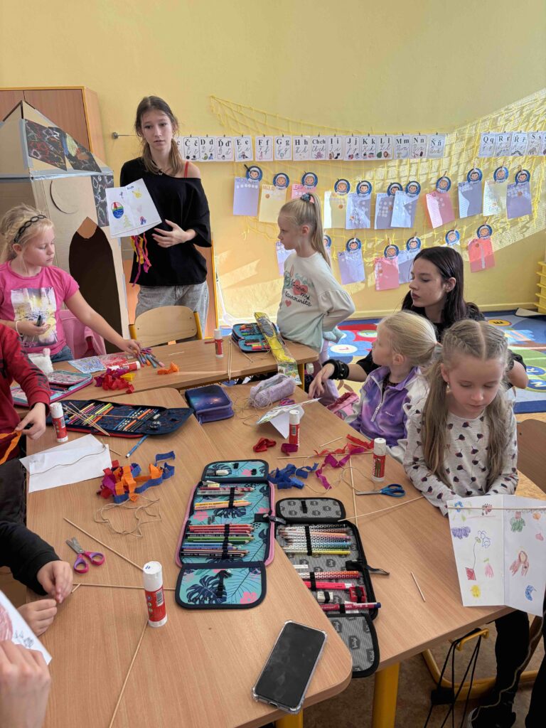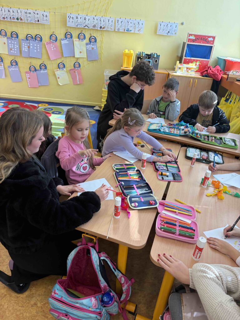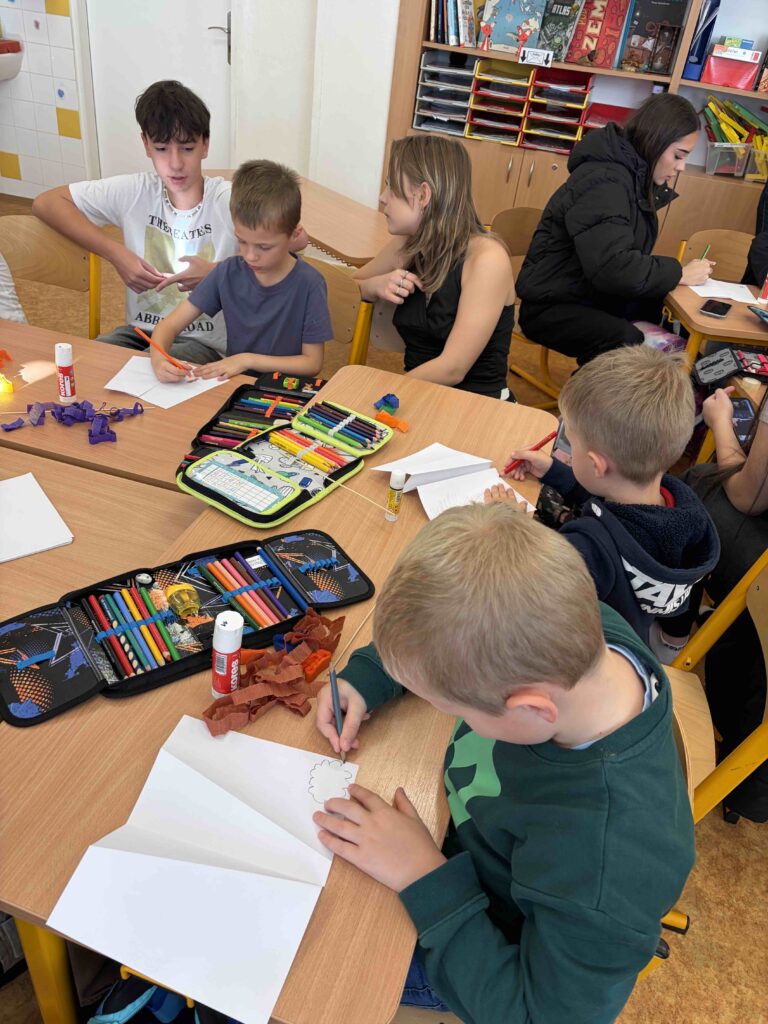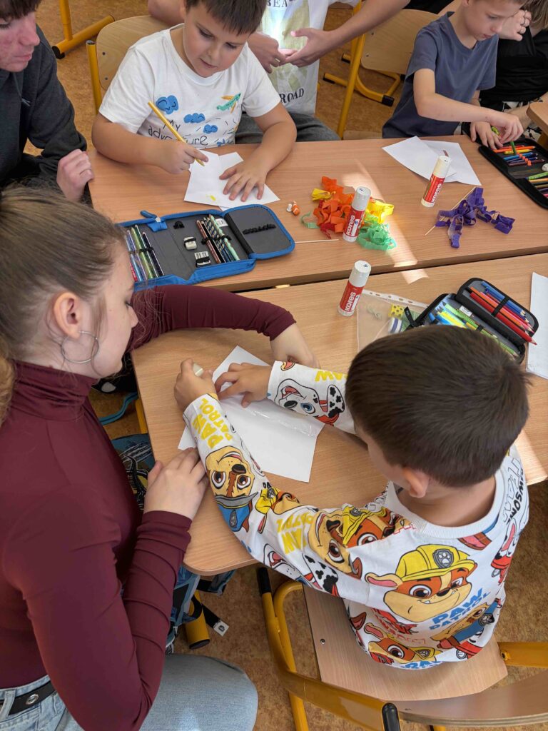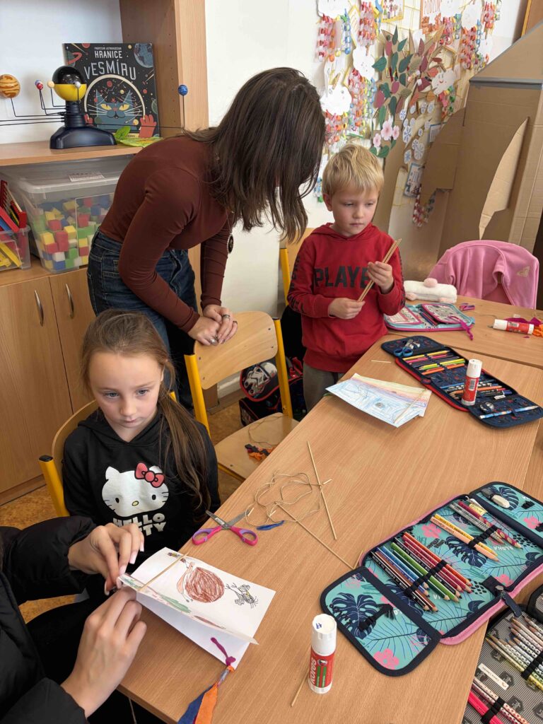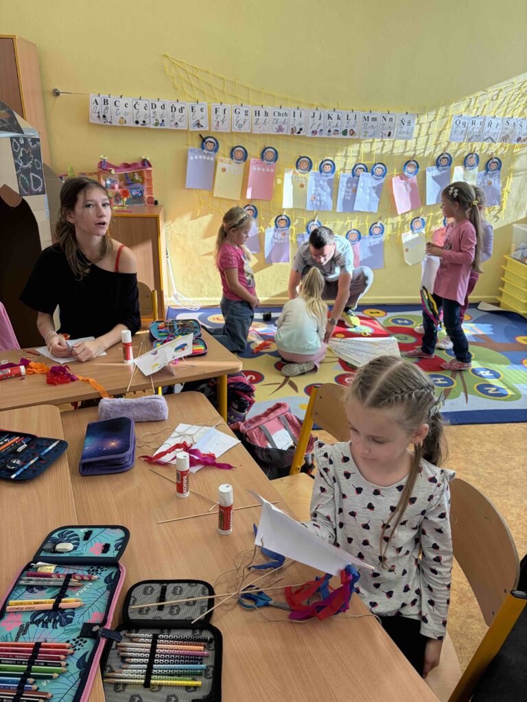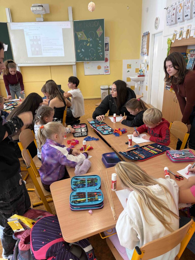 Už hned po ránu bylo ve třídě veselo – na tabuli přibývaly barevné pentličky, které děti kreslily na ocas draka. Místo klasického zasedacího pořádku vznikla tři „hnízda“, kde se společně tvořilo, stříhalo, lepilo a zdobilo. Každý prvňáček měl po svém boku svého deváťáka – parťáka, který pomohl s uzlíky, lepidlem i fantazií.