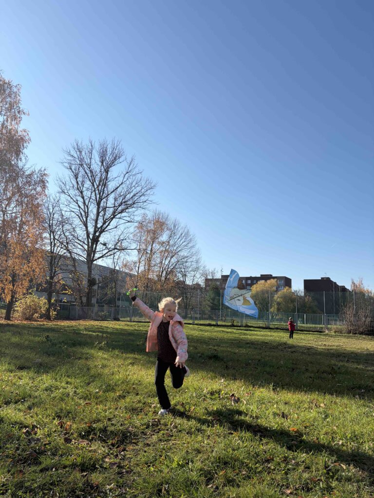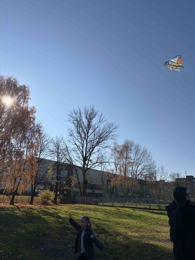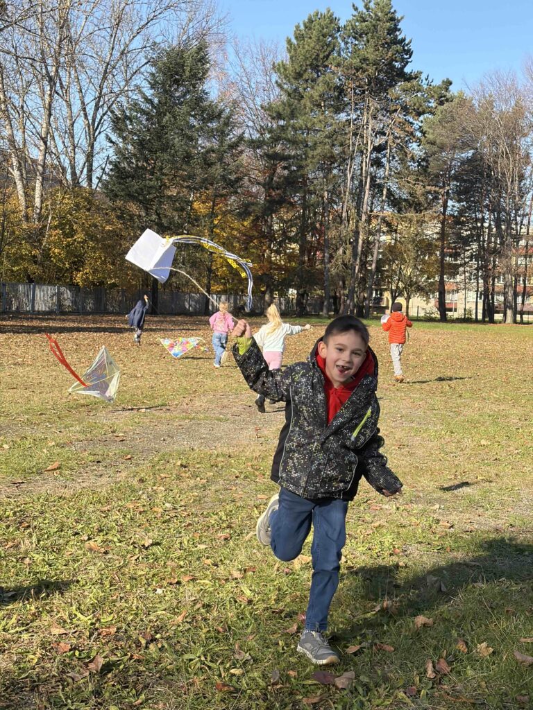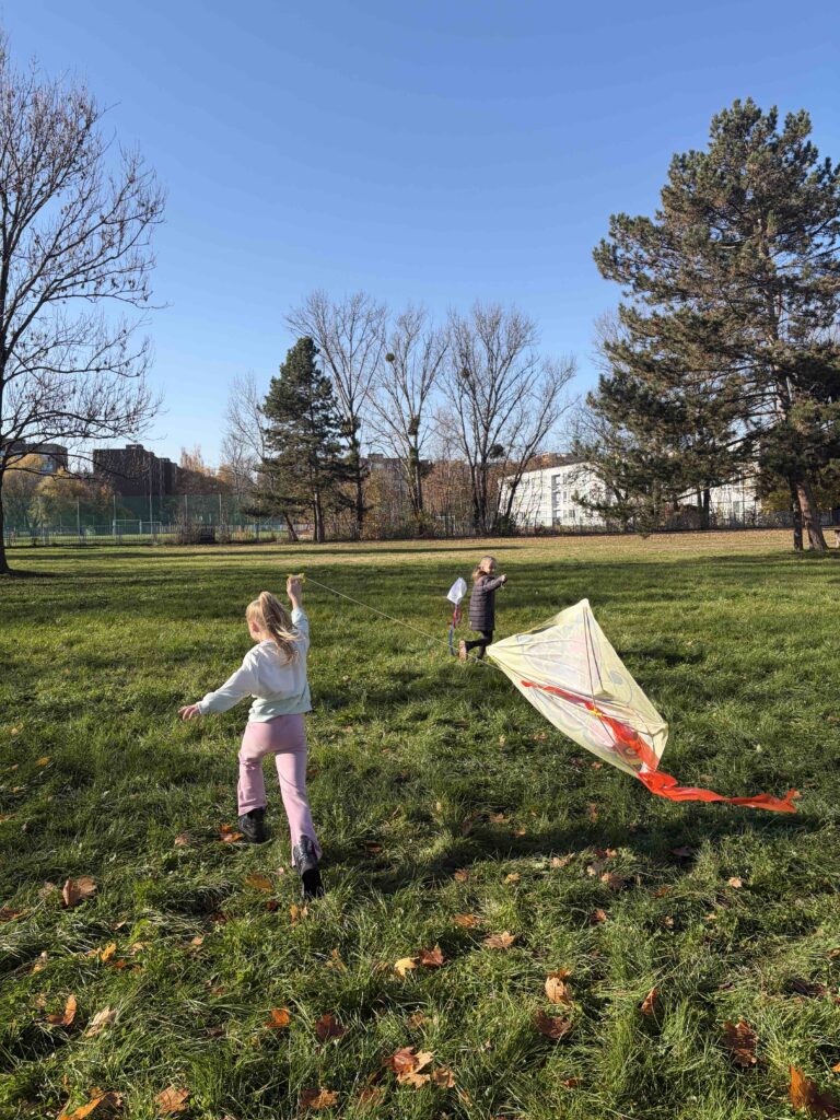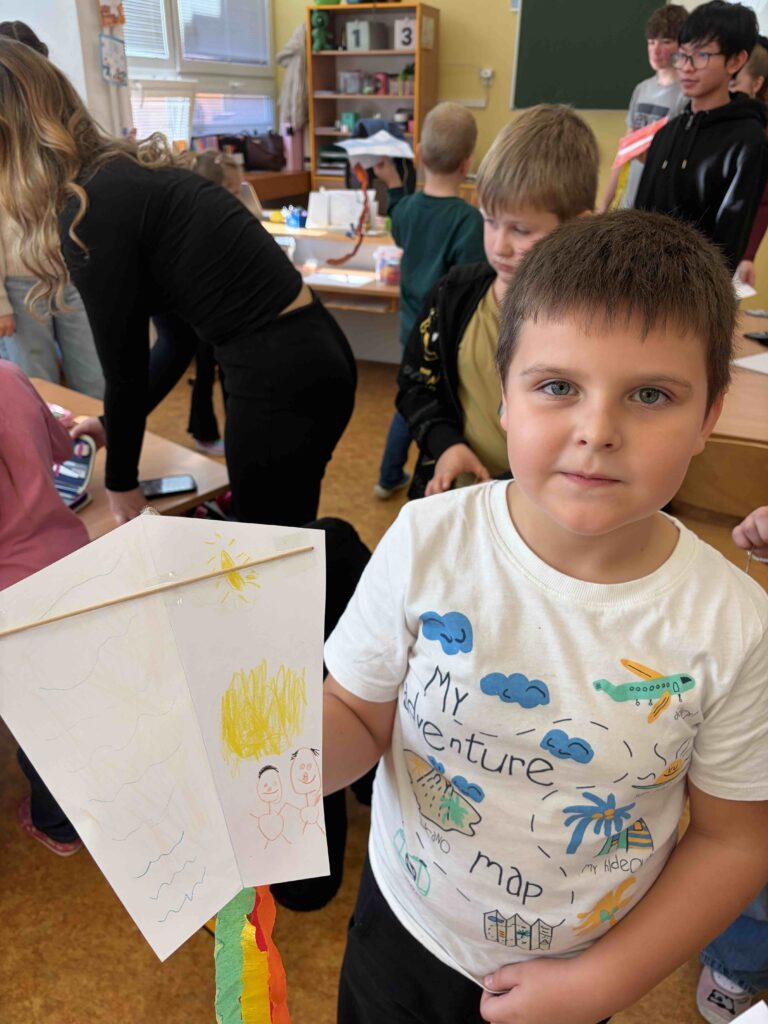 Když byli draci hotoví, vydali se všichni společně na školní zahradu. Sluníčko se usmívalo a čekalo, až každý provětrá svého draka. A jakmile se první z nich vznesl, ozvalo se: „Jéééé!“ – a bylo jasno. Úspěch! 🎉 Děti pouštěli s deváťáky i klasické draky.