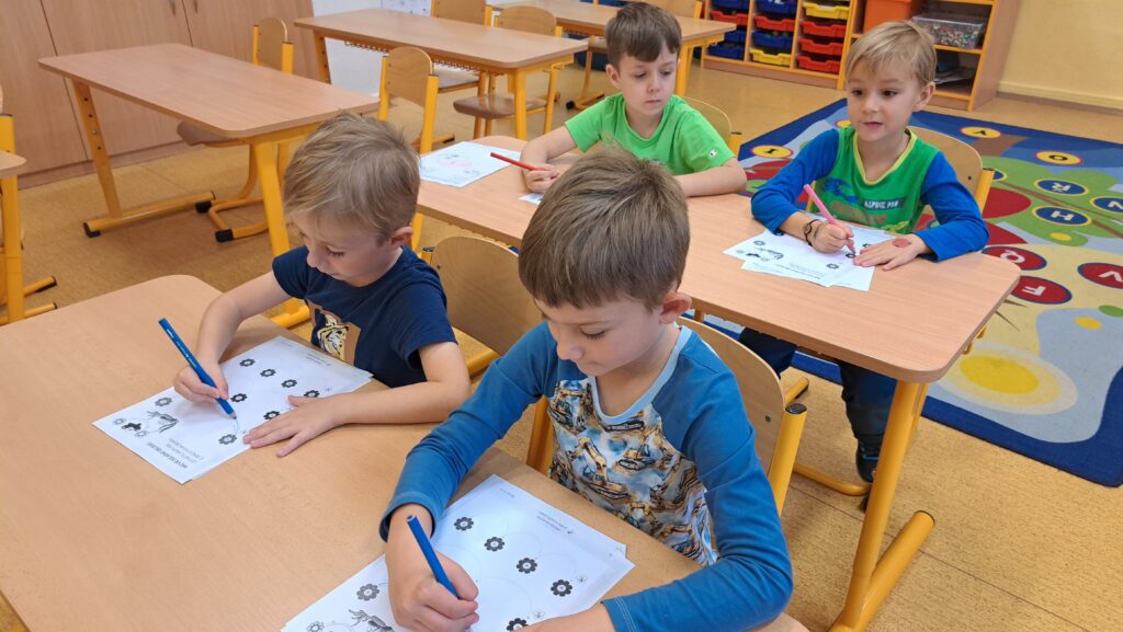 Začali jsme rozcvičkou pro 🖐️ prstíky – s říkankami a pohybem, který nám pomáhá připravit ruce na psaní. Pak jsme si ukázali, jak správně ✍️ držet tužku a 🪑 sedět, aby se nám dobře pracovalo. Na 🗒️ pracovních listech se pak objevovaly první čáry, 〰️ vlnky i různé tvary – zkrátka kouzla, která zvládne každý malý 🧙♂️ kouzelník s ✏️ tužkou v ruce.