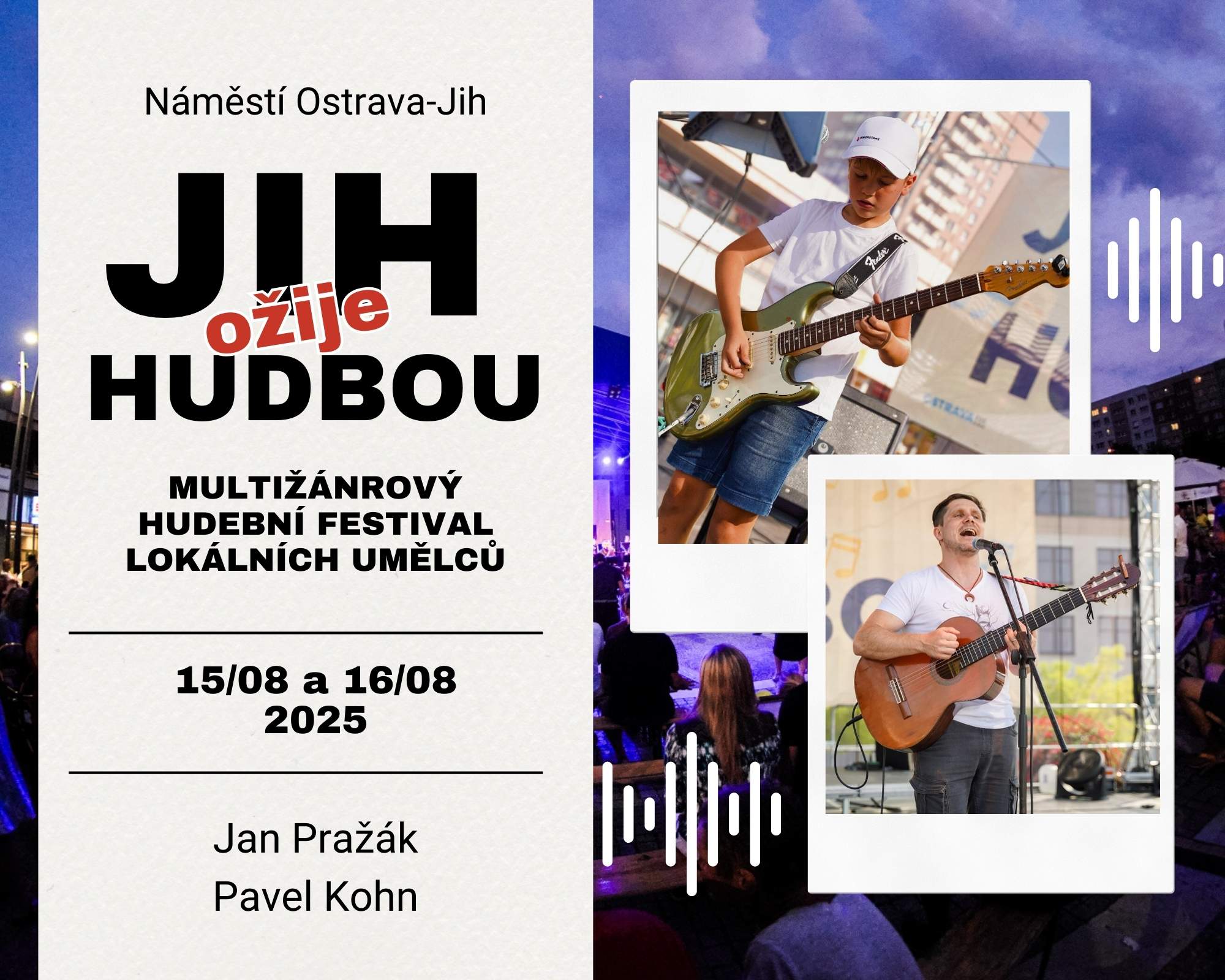 Ačkoli školní rok už za chvíli poběží naplno, ještě se na okamžik vracíme k prázdninovým zážitkům. Jedním z nich byl multižánrový festival místních umělců Jih ožije hudbou, který se konal 15. a 16. srpna na Náměstí Ostrava-Jih. Během dvou dnů se na pódiu vystřídalo 14 kapel, hudebnic a hudebníků – a mezi nimi také dva zástupci naší školy!