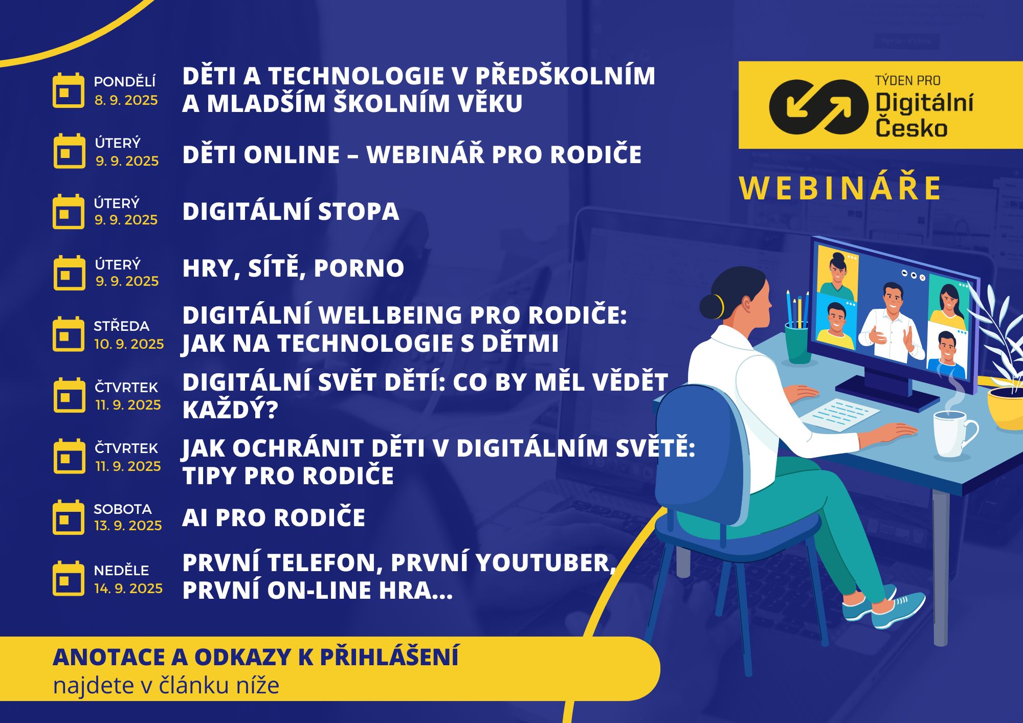Vážení rodiče, zveme vás na webináře pořádané v rámci Týdne pro digitální Česko, které se zaměří na to, jak děti provázet digitálním světem. Dozvíte se, jak technologie ovlivňují jejich vývoj, jak s nimi mluvit o online prostředí, jak dětem nastavit zdravé hranice a posílit jejich bezpečí.