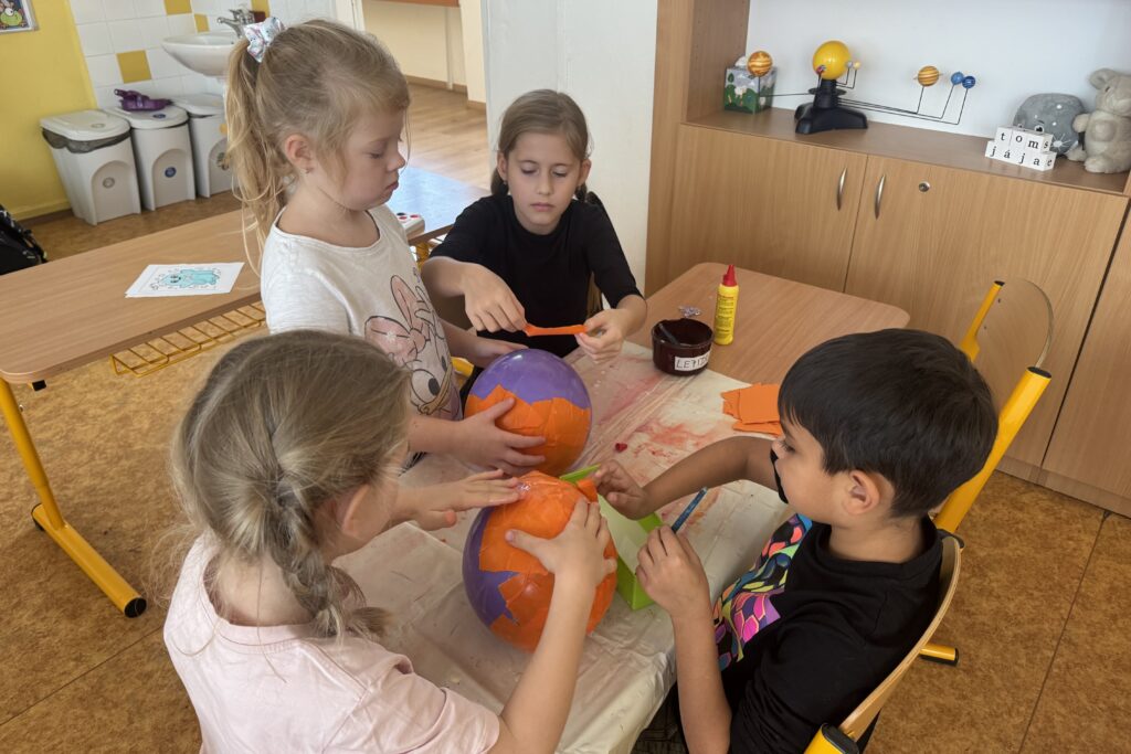 Děti vytvořily originální dýně, které jsme následně rozsvítili. Stejně pečlivě jsme tvořili i draky, které jsme zdobili listy a podzimními barvami. Obě aktivity přinesly mnoho radosti a povedených výtvorů.