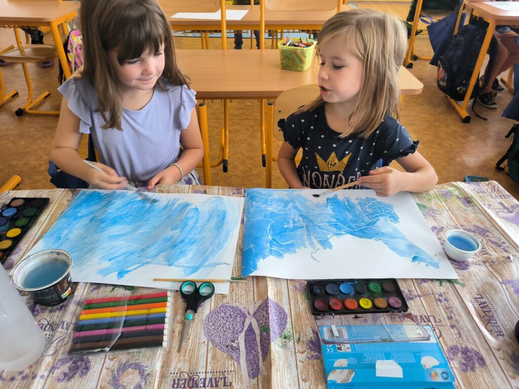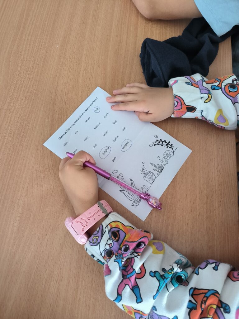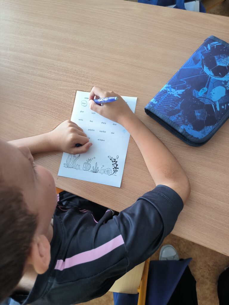 Nejprve si každý žák připravil papír, na který pomocí voskovek a vodových barev namaloval moře a vlny. Výsledkem byly krásně barevné podklady, které bylo potřeba nechat oschnout. Mezitím jsme se přesunuli k pracovnímu listu. Děti poslouchaly anglickou písničku o moři a mořských živočiších a z nabízených slov vybíraly ta, která v písni zaslechly. Aktivita je bavila a zároveň vedla k pozornému poslechu a práci s cizím jazykem.