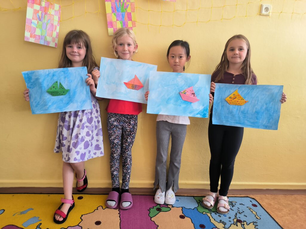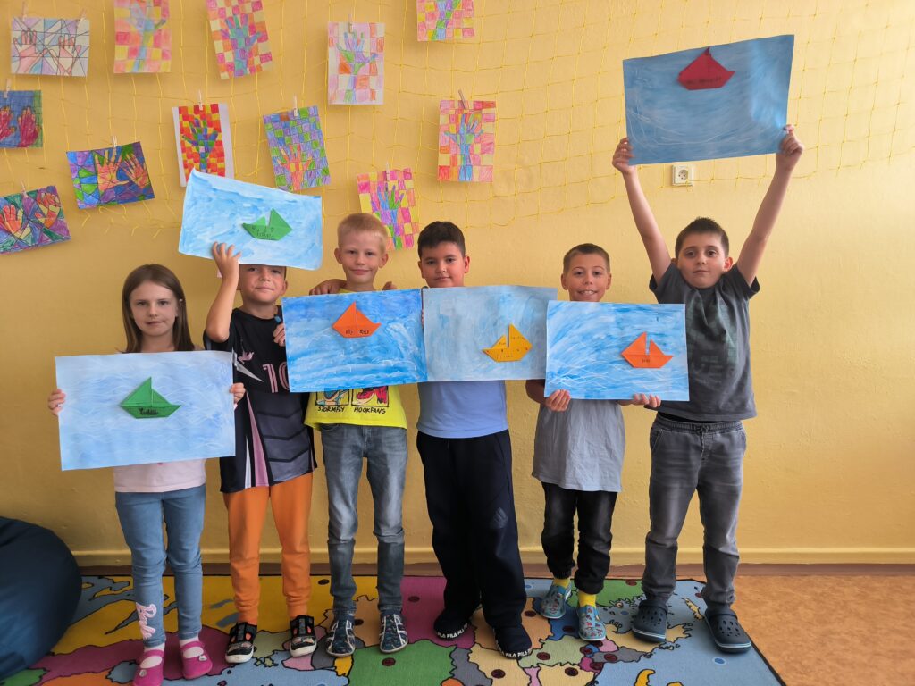 Jakmile výkresy oschly, vrátily se děti k výtvarné části. Složily si vlastní origami loďku, kterou si vyzdobily, pojmenovaly a nakonec ji přilepily zpět do svého výkresu.