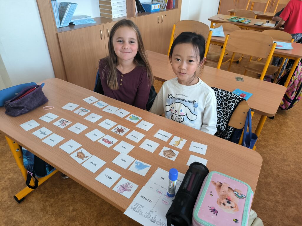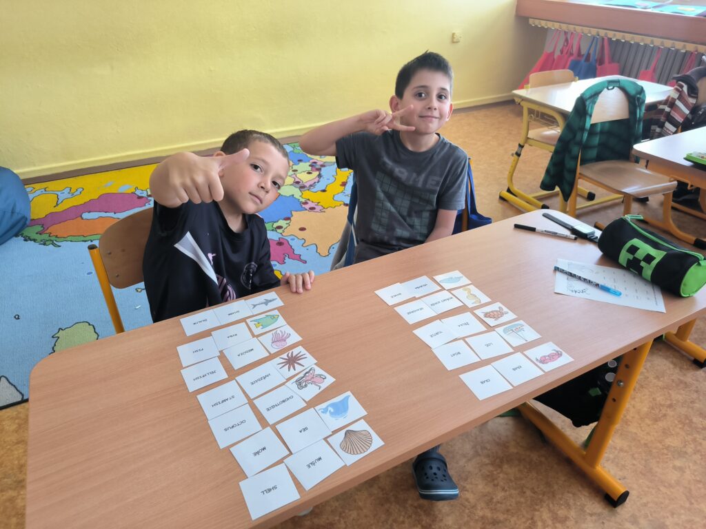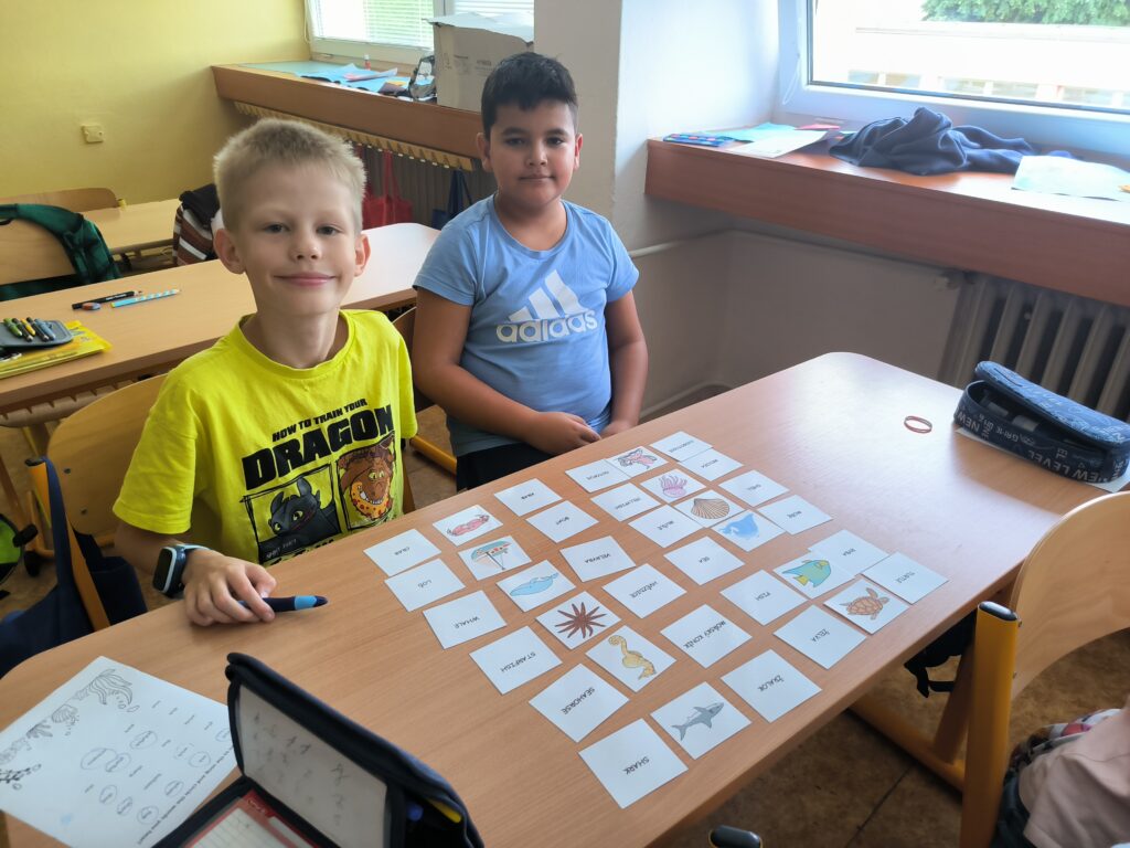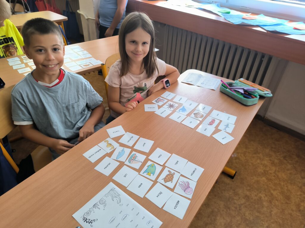 Úplně na závěr si děti ještě zahrály hru s kartičkami. Jejich úkolem bylo vytvořit trojice – propojit obrázek mořského živočicha s českým a anglickým názvem. Díky tomu si mohly ověřit, co všechno si zapamatovaly z písničky, a zábavnou formou si znalosti upevnily.