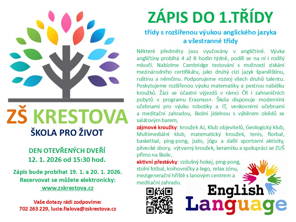 Odpovědi na Vaše dotazy a bližší informace k zápisu získáte na emailu lucie.fialova@zskrestova.cz.