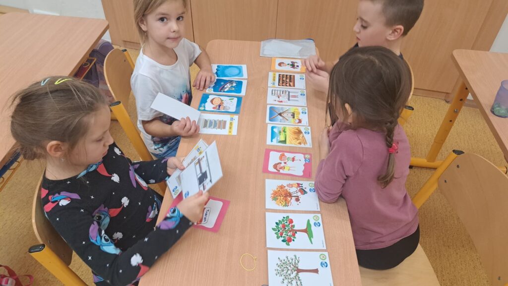 Plnili jsme různé soutěžní úkoly ve skupinkách a sbírali jsme „pětky“ pro náš tým. Byla to velká zábava a všechno jsme zvládli na jedničku! ⭐